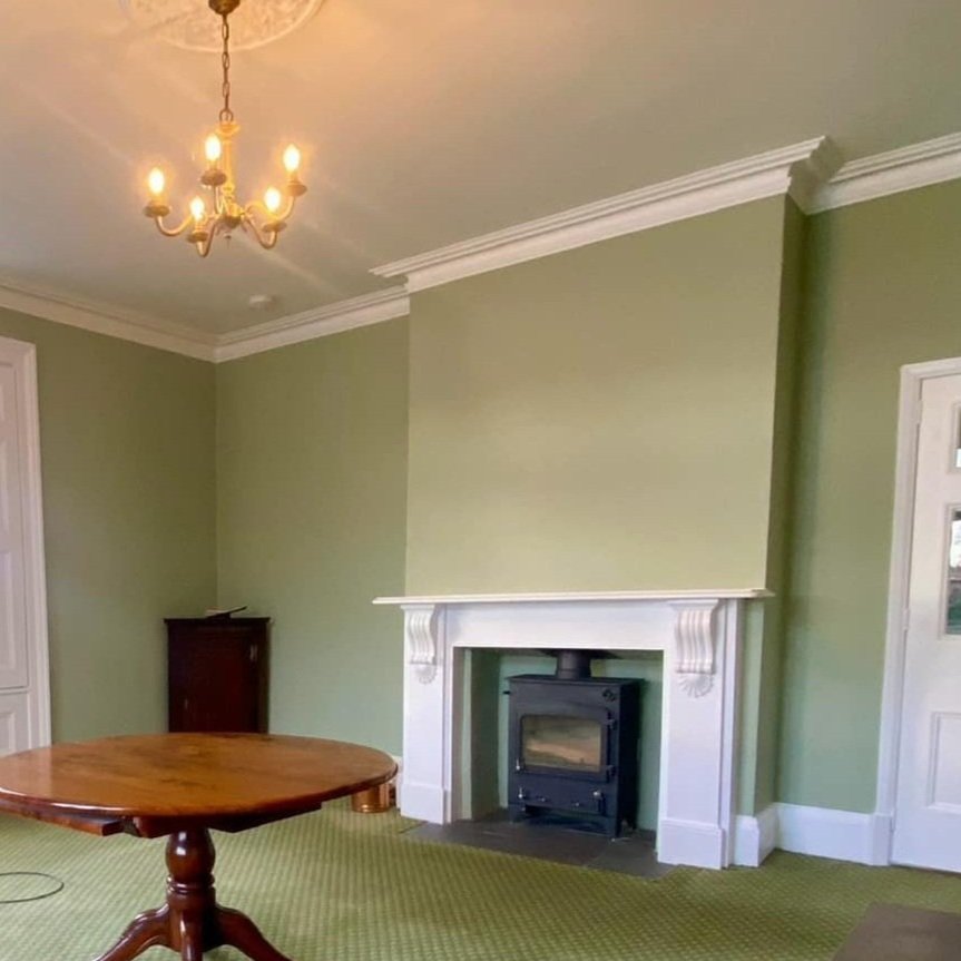 Redecoration to a very spacious dining room. All walls were lined as they were lumpy and cracked. Farrow & Ball Vert De Terre on the walls, white on ceilings and woodwork to really make the colour pop.